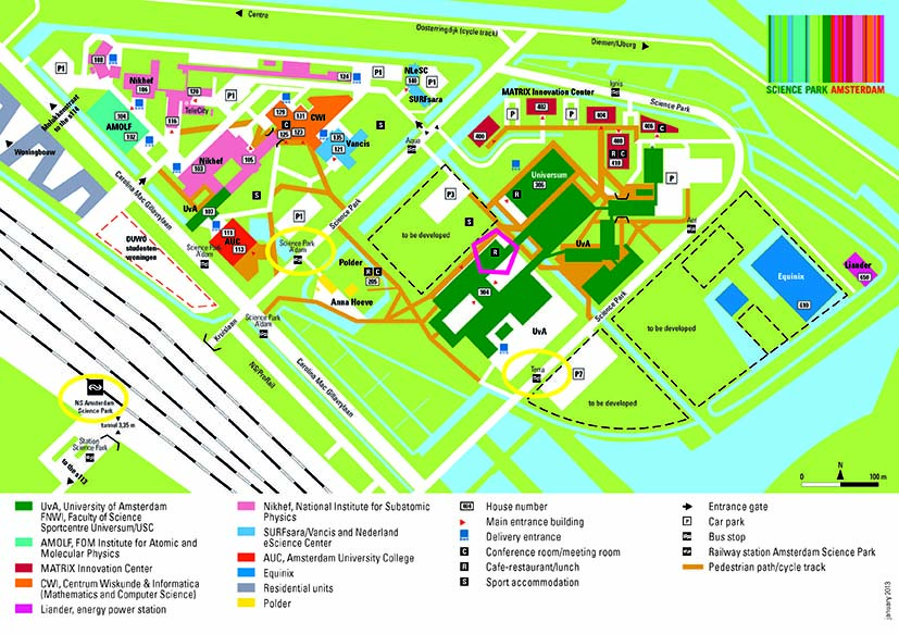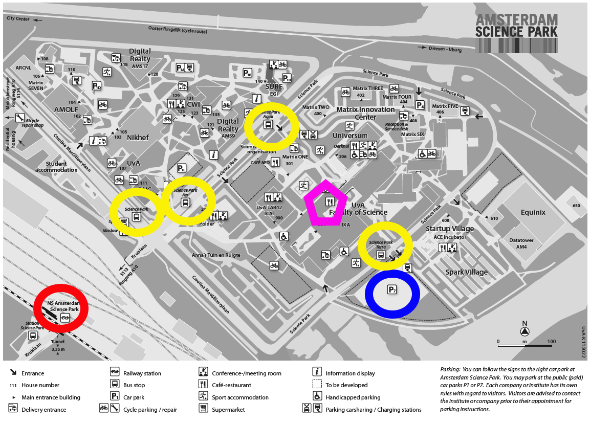 An NS train station “Amsterdam Science Park” (red) is located at just 400 meters distance from the Science Park building. Schedule your trip with the Dutch train-system www.ns.nl. As an alternative on can take from Amsterdam Central station the metro (or train) to Amsterdam Amstel station. From here bus 40 will bring you to the University grounds at Science Park, having multiple stops (yellow) at 100 meters distance from the Science Park building. Schedule your trip by public transport at www.9292.nl.