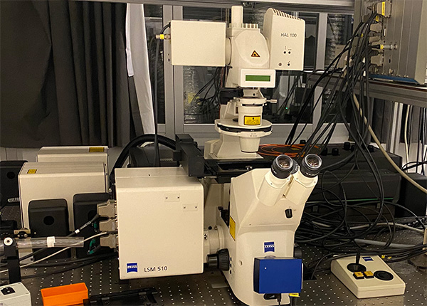 | Description: The Zeiss LSM510 is a four-channel confocal microscope also capable to perform UV- or MultiPhoton-excitation. | Lasers: | 355 (405) nm UV laser 445 nm diode laser 488 nm diode laser 514 nm diode laser 543 nm HeNe laser 561 nm diode laser 633 nm HeNe laser 700-960 nm Multi-photon laser For more info about laser safety, contact Ronald Breedijk (+7860) |